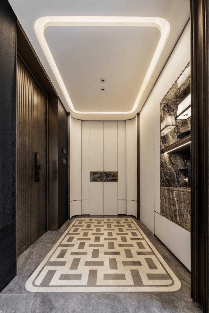 大堂内部空间以浅色调营造温馨氛围,细节处则尽显奢华。地面采用石材拼花,墙面满铺大尺度岩板,并以高难度的热弯工艺于转角处实现流畅弧形,在提升视觉整体性的同时,也消除了安全隐患。天花采用GRG材料塑造圆弧造型,结合无主灯设计,共同营造出堪比五星级酒店的豪华质感与归家仪式感。
