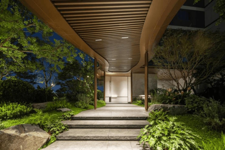 在高端住宅领域,归家动线的品质是衡量居住体验的重要标尺。美的·未来中心|江山在此层面倾注匠心。在社区内部,项目以“五重景观”园林与全龄段架空层泛会所体系,重新定义了社区生活,通过乔木夹道、蜿蜒园路与四季花木的层层递进,实现连廊与绿意的穿插引导,实现步移景异的沉浸式体验。