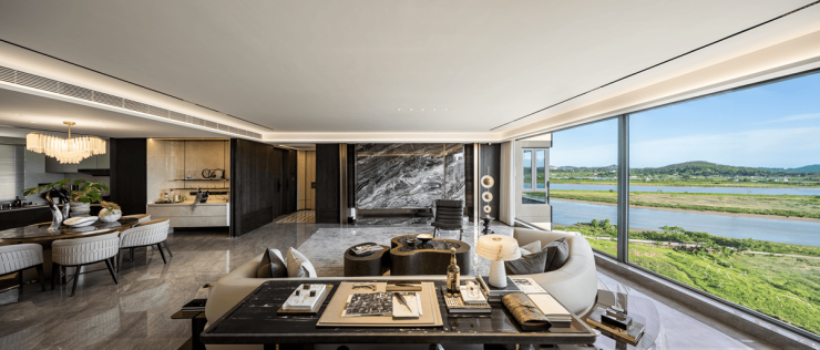 美的·未来中心|江山建面约220平方米的明星户型,户型极致追求景观视野的最大化。通过LDKB一体化设计(客厅、餐厅、厨房、阳台一体化),将核心区整合为开阔的家族互动厅。南向配置面宽约8.6米、进深约2米的阔景阳台,与客厅无缝衔接,形成巨幕般的观景面。东向主卧更创新采用270°L型转角落地玻璃幕墙,将壮美江景无界引入室内,成就“空中别墅”的视觉震撼。